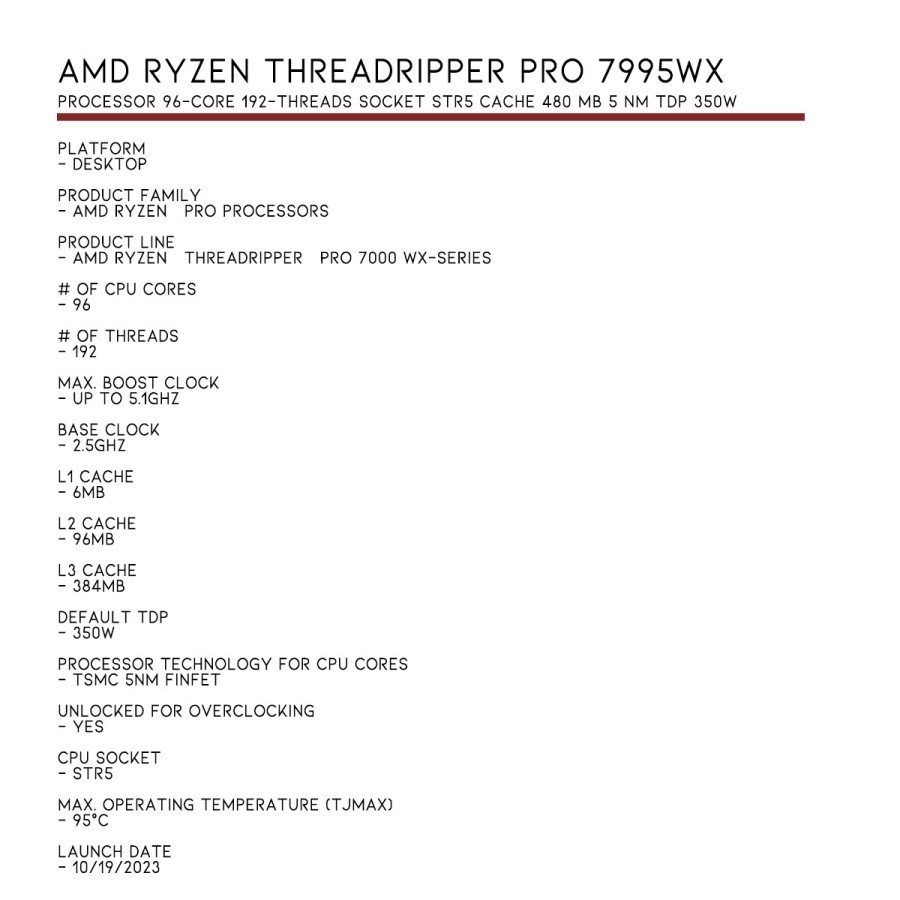 ?????????????? : Platform - Desktop Product Family - AMD Ryzen™ PRO Processors Product Line - AMD Ryzen™ Threadripper™ PRO 7000 WX-Series # of CPU Cores - 96 # of Threads - 192 Max. Boost Clock - Up to 5.1GHz Base Clock - 2.5GHz L1 Cache - 6MB L2 Cache - 96MB L3 Cache - 384MB Default TDP - 350W Processor Technology for CPU Cores - TSMC 5nm FinFET Unlocked for Overclocking - Yes CPU Socket - sTR5 Max. Operating Temperature (Tjmax) - 95°C Launch Date - 10/19/2023 *OS Support - Windows 11 - 64-Bit Edition - RHEL x86 64-Bit - Ubuntu x86 64-Bit *Operating System (OS) support will vary by manufacturer. Connectivity - PCI Express® Version : PCIe 5.0 - System Memory Type : DDR5 - Memory Channels : 8 - System Memory Specification : Up to 5200MT/s
