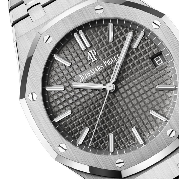 : Slate grey dial with “Grande Tapisserie” pattern, white gold applied hour-markers and Royal Oak hands with luminescent coating.
