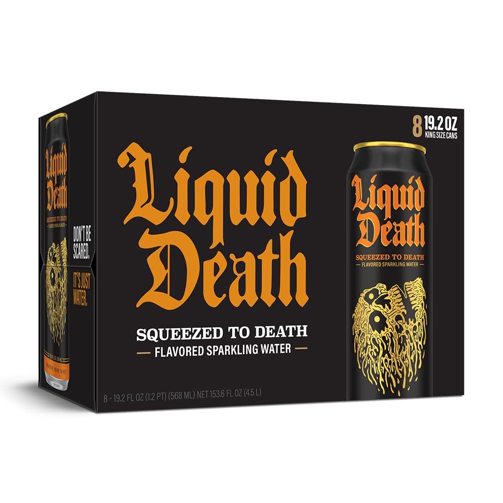 Liquid Death, Squeezed To Death Sparkling Water, Orange Flavored Sparkling Beverage Sweetened With Real Agave, Low Calorie & Low Sugar, 8-Pack (King Size 19.2oz Cans)