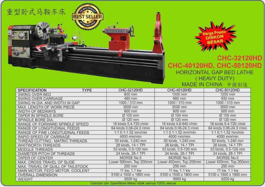 Mesin Bubut Besi Gap Bed Lathe 1250x930mm CHC50120HD ** Berat Asli : 6200 Kg Specification : - Swing Over Bed 1250 mm - Swing Over Carriage 930 mm - Swing In Diameter and Width In Gap 1000 / 310 mm - Width Of Bedways 600 mm - Taper In Spindle Bore 105 mm - Spindle Bore Diameter 120 mm - Max. Travel Of Quill Of Tailstock 250 mm - Main Motor, Feed Motor, Coolent 11 Kw, 1,1 Kw - Overall Dimension 5100 x 1500 x 1800 mm (**) - Weight 6200 Kg (**) (**) = Berat dan Ukuran belum termasuk packing ka...