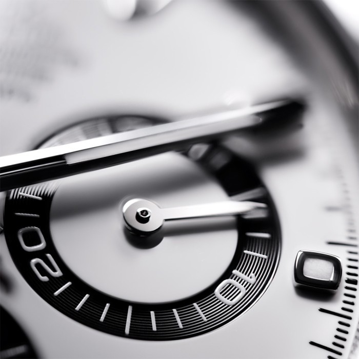 : Centre hour, minute and seconds hands, small seconds hand at 6 o'clock. Chronograph (centre hand) accurate to within 1/8 of a second, 30-minute counter at 3 o'clock and 12-hour counter at 9 o'clock. Stop seconds for precise time setting