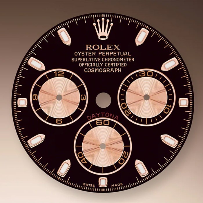 This model features a bright black and Sundust dial with snailed counters, 18 ct gold applique hour markers and hands with a Chromalight display, a highly-legible luminescent material. To preserve the beauty of its pink gold watches, Rolex created and patented an exclusive 18 ct pink gold alloy cast in its own foundry: Everose gold.