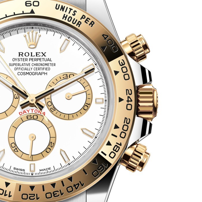 With its tachymetric scale, its three counters and its pushers, the Cosmograph Daytona was designed to be the ultimate timing tool for endurance racing drivers. The bezel features a tachymetric scale to read average speed over a given distance based on elapsed time. This model features a white dial with snailed counters, 18 ct gold applique hour markers and hands with a Chromalight display, a highly-legible luminescent material.