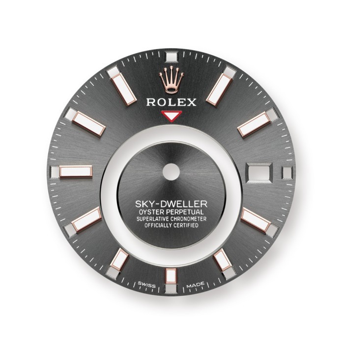 The Sky-Dweller’s new Oysterflex bracelet, developed by Rolex and patented, offers a sporty alternative to metal bracelets. The bracelet attaches to the watch case and the Oysterclasp by a flexible titanium and nickel alloy metal blade. To preserve the beauty of its pink gold watches, Rolex created and patented an exclusive 18 ct pink gold alloy cast in its own foundry: Everose gold.
