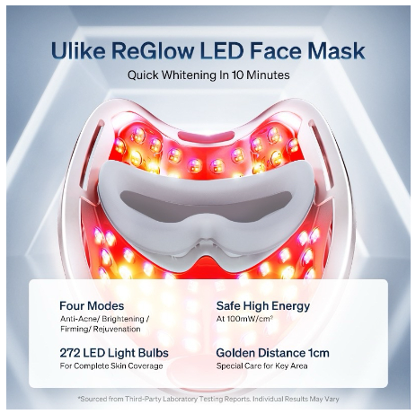 Ulike ReGlow LED Face Mask Quick Brightening In 10 Minutes -Four modes:Anti-Acne/ Brightening / Firming/ Rejuvenation -Safe Energy up to 100 mW/cm? -272 top-class professional LED light bulbs -Golden Distance 1cm Industry-leading LED Face Mask With Exclusive Mirror Enhanced Light Intensification Technology™️ Glowing Results in 14 days Skin radiance increased by 12.9% 39.44% reduction in the number of under-eye wrinkles 7.89% reduction in redness across the face Reduction of acne by 17.58% 10 min hands-free treatment targets 4 needs Solving the Deep Skin Problems 415nm Blue light targets oil production and acne 590nm Yellow light soothes and brightens the skin 630nm Red light stimulates collagen production 830nm Near-infrared light accelerates skin metabolism Combination Works Better Than Solo Ulike ReGlow features 4 skincare modes, each mode features 2 or 3 clinical wavelengths to achieve better results: 01/ Anti-Acne Light--415nm blue light +630nm red light Targeted problems: Skin water and oil imbalance and acne 02 /Brightening Light: 630nm red light +830nm infrared light +590nm yellow light Targeted problems: Dark yellow and dull skin, uneven skin tone, and rough skin 03 /Firming Light: 630nm red light +830nm infrared light Targeted problems: Skin laxity, fine lines, and other skin problems caused by aging 04/ Rejuvenation: Light:590nm yellow light +830nm infrared light Targeted problems: Damaged skin barrier, redness of sensitive skin, and seasonal skin sensitivity